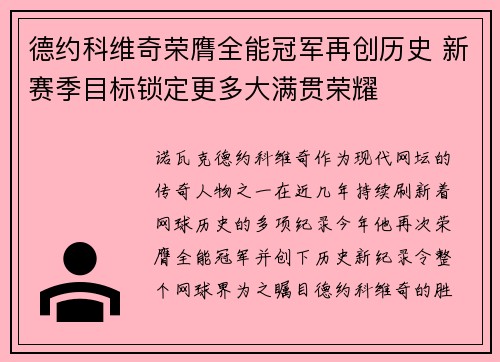 诺瓦克·德约科维奇,作为现代网坛的传奇人物之一,在近几年持续刷新着网球历史的多项纪录。今年,他再次荣膺全能冠军并创下历史新纪录,令整个网球界为之瞩目。德约科维奇的胜利不仅是他个人努力和才华的体现,更是全能运动员的象征——他能够在多种不同的赛场上展现卓越的实力和适应性。随着新赛季的到来,德约科维奇的目标也明确而坚定:继续锁定更多大满贯冠军,争取历史的更高成就。本文将从四个方面对德约科维奇荣膺全能冠军再创历史以及新赛季目标进行详细分析,并展望他未来的网球之路。