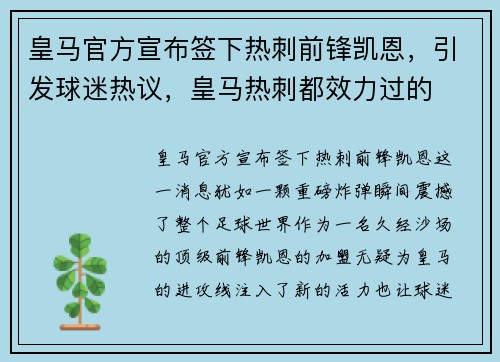 皇马官方宣布签下热刺前锋凯恩,引发球迷热议,皇马热刺都效力过的
