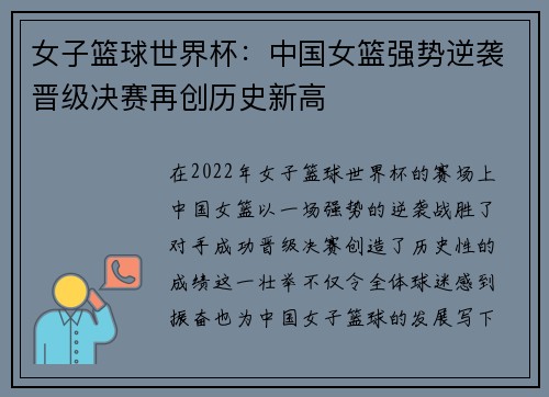 女子篮球世界杯:中国女篮强势逆袭晋级决赛再创历史新高