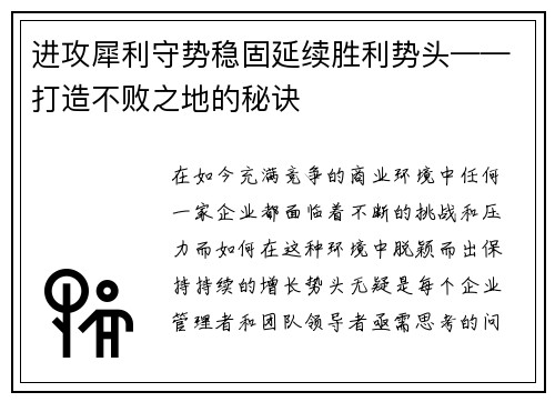 进攻犀利守势稳固延续胜利势头——打造不败之地的秘诀