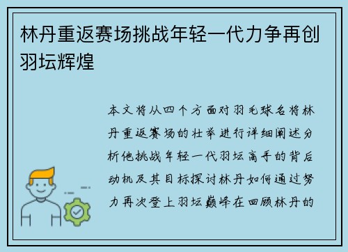 本文将从四个方面对羽毛球名将林丹重返赛场的壮举进行详细阐述,分析他挑战年轻一代羽坛高手的背后动机及其目标,探讨林丹如何通过努力再次登上羽坛巅峰。在回顾林丹的辉煌成就后,我们将深入讨论他重返赛场的意义,以及在新的竞技环境中,如何通过自身的经验和毅力与年轻选手一较高下,力争再创辉煌。文章将通过多个角度分析林丹复出对羽毛球界的影响及其个人奋斗的精神,最终探讨他能否完成这一伟大的挑战。