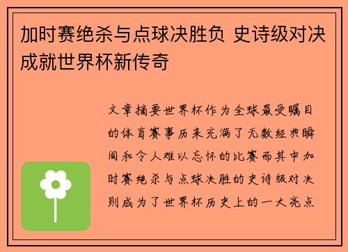世界杯作为全球最受瞩目的体育赛事,历来充满了无数经典瞬间和令人难以忘怀的比赛。而其中,加时赛绝杀与点球决胜的史诗级对决,则成为了世界杯历史上的一大亮点。每当比赛进入加时赛和点球大战阶段,球迷们的心情都在剧烈波动,赛场上所展现出的竞技精神、团队合作与个人英雄主义,常常成为赛事传奇的一部分。在这类决胜时刻的背后,不仅是对球员技巧的挑战,更是心理素质和意志力的比拼。本文将从加时赛的惊心动魄、点球决胜的残酷与荣耀、经典对决的历史意义以及如何成就世界杯新传奇四个方面,深入分析这类决胜时刻如何构建成世界杯的新传奇,讲述那些为球迷铭记的传奇赛事背后的故事与精神。