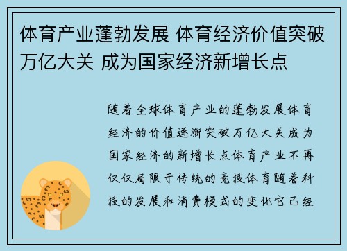 综上所述,体育产业的蓬勃发展和体育经济价值突破万亿大关,既是国家经济新增长点的体现,也是全球体育市场不断拓展的必然趋势。体育产业不仅在促进经济增长、提升就业、推动消费升级方面发挥了重要作用,而且通过科技创新、产业多元化等方面的突破,为未来的发展注入了更多的可能性。伴随着国家政策的支持和引导,体育产业将进一步成为国家经济的强大动力源泉。